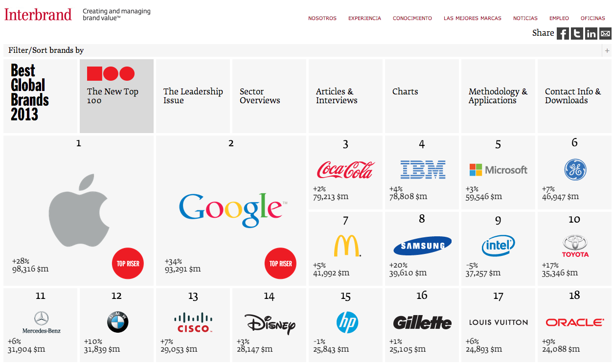 El valor de la marca de la manzana ha aumentando un 28% con respecto a 2012, apeando del liderazgo por primera vez en 13 años a la marca de bebida | Cinco de las diez primeras marcas corresponden a gigantes tecnológicos
